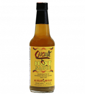 Since 1997, Wendy and Paul Bridgeman have cultivated Chone™️ peppers on their property in Laguna Niguel, CA. Using the same recipe that they developed in the late 90’s, Paul and Wendy have been handcrafting Chone™️ Hot Sauce from four unique hot chili pepper varieties, and the perfect blend of onion and garlic. Satisfying local South Orange County pepper heads for more than a decade, the Bridgemans were encouraged by family and friends to take the product commercial. Chone™️ Hot Sauce is now available for sale direct to consumers. It is made with the same attention to detail and all natural fresh high quality ingredients in a locally owned commercial kitchen. This extraordinary sauce epitomizes life on the California Riviera. Use Chone™️ to add intensity to any of your favorite foods!